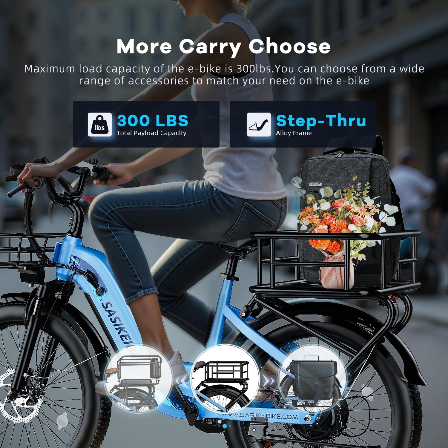 - Comfort and convenience-Step-through frame of the Sasikeibike City Cruiser e-bike is designed for comfort, allowing riders to get on and off the e-bike with ease. The adjustable handlebar bar and seat can be adjusted to the ideal position to ensure that riders of different heights can ride with ease and comfort. Full-coverage fenders protect you from mud and water. The sturdy rear frame adds versatility for carrying groceries or other essentials, perfect for daily commuting, shopping