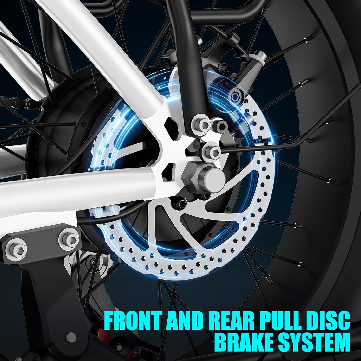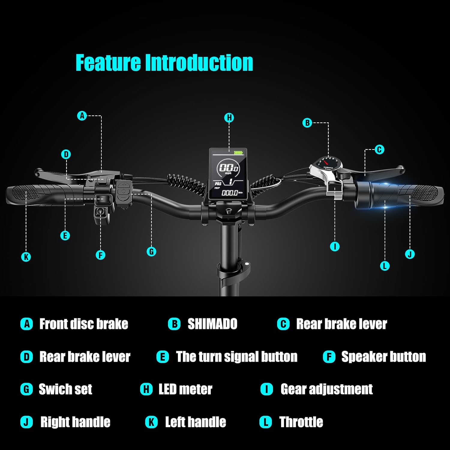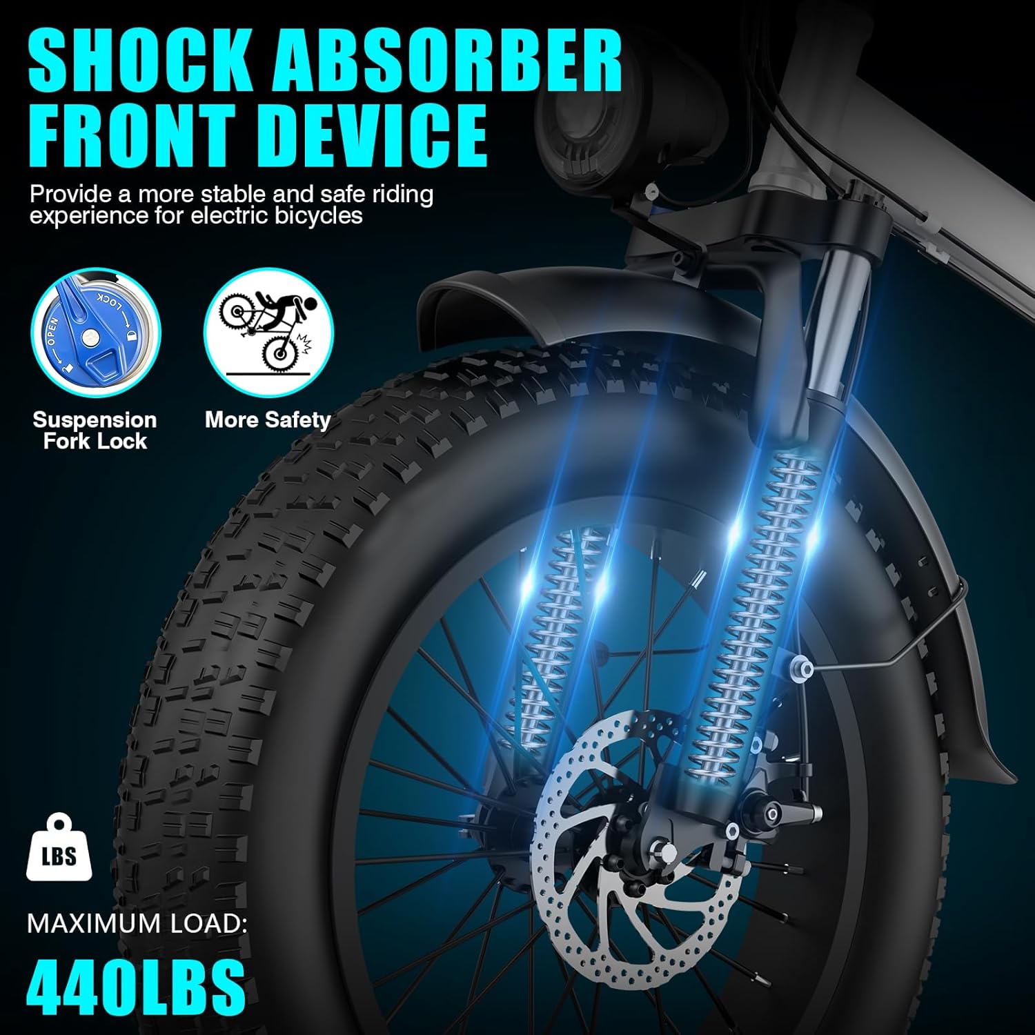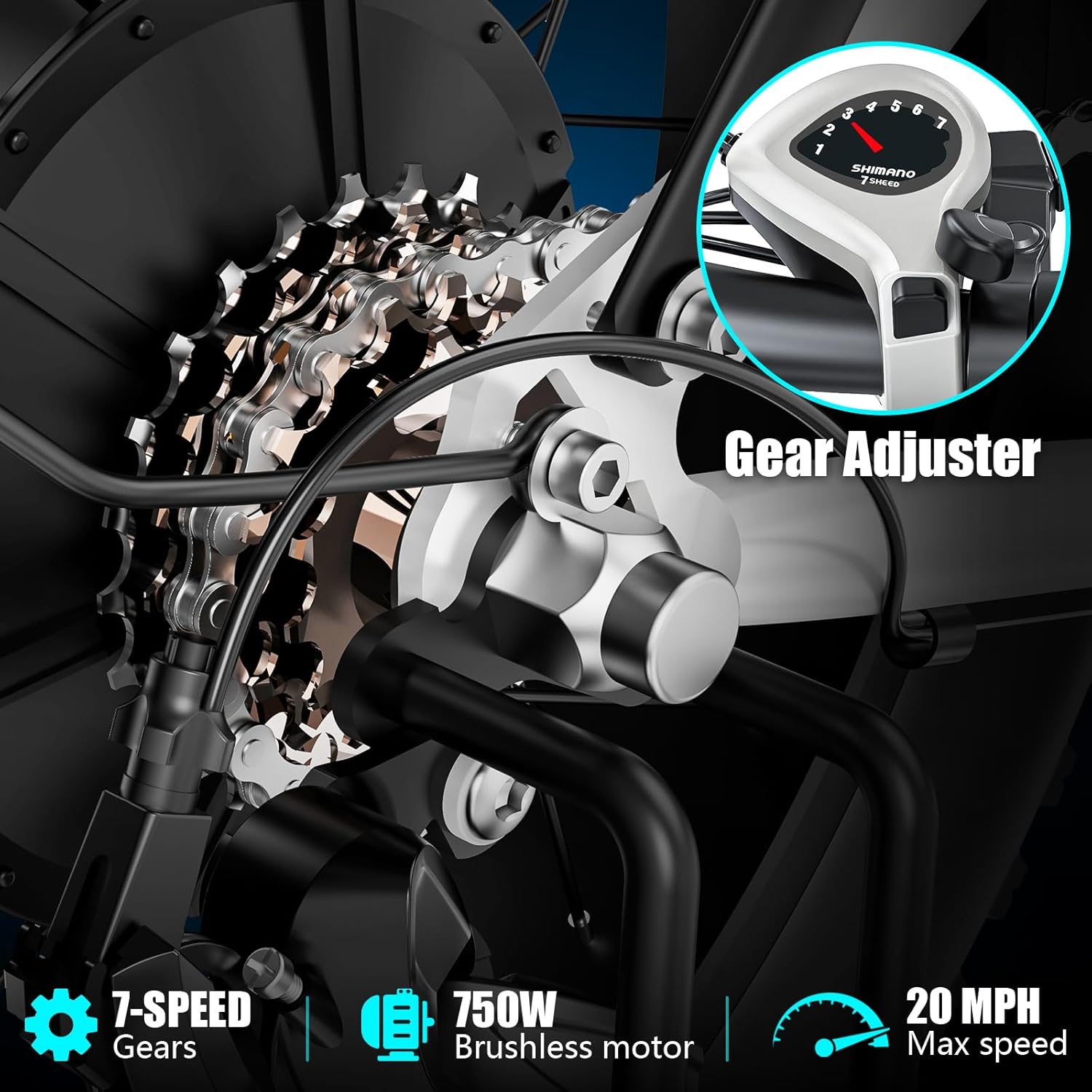 Discover a New Way to Ride: Powerful, Reliable, and Fun Electric Biking Step into the world of electric biking with a machine designed for performance, comfort, and adventure. This 750W electric bicycle is your perfect partner for daily commutes, weekend explorations, and everything in between. Powerful Performance for Every Journey Experience the thrill of a 750W brushless gear hub motor. This quiet yet powerful motor provides the torque you need to climb hills with ease and accelerate quickly in urban traffic, reaching a top speed of 20 MPH. Say goodbye to sweating on your commute. Go Further with Confidence Never worry about running out of power mid-trip. The removable 48V 13AH battery is designed for long-range travel, offering up to 37 miles per charge. Simply take the battery indoors to charge for convenience and to prolong its lifespan. The built-in Battery Management System (BMS) ensures intelligent safety for peace of mind. Built for Comfort and Heavy-Duty Use We have engineered this bike for real-world use. The high-capacity 440 lbs load limit makes it suitable for a wide range of riders. Coupled with 20-inch fat tires and a front shock absorber, the bike provides a stable, smooth, and safe riding experience by absorbing vibrations from uneven roads or trails. Total Control at Your Fingertips You are in complete command. The intuitive handlebar control set includes a 7-speed gear adjuster, a clear LED display for tracking your speed and battery level, and a responsive thumb throttle for instant power without pedaling. The front and rear disc brakes ensure you can stop reliably whenever needed. Product Specifications: Motor: 750W Brushless Geared Hub Motor Battery: 48V 13AH Removable Lithium-Ion Max Speed: 20 MPH Max Range: Up to 37 Miles Max Load Capacity: 440 LBS Tires: 20 inch x 4.0 Fat Tires Brakes: Front and Rear Disc Brakes Gears: 7-Speed Suspension: Front Shock Absorber Net Weight: 73.5 lbs Product Dimensions: 50.3 inch L x 24.8 inch W x 68.5 inch H