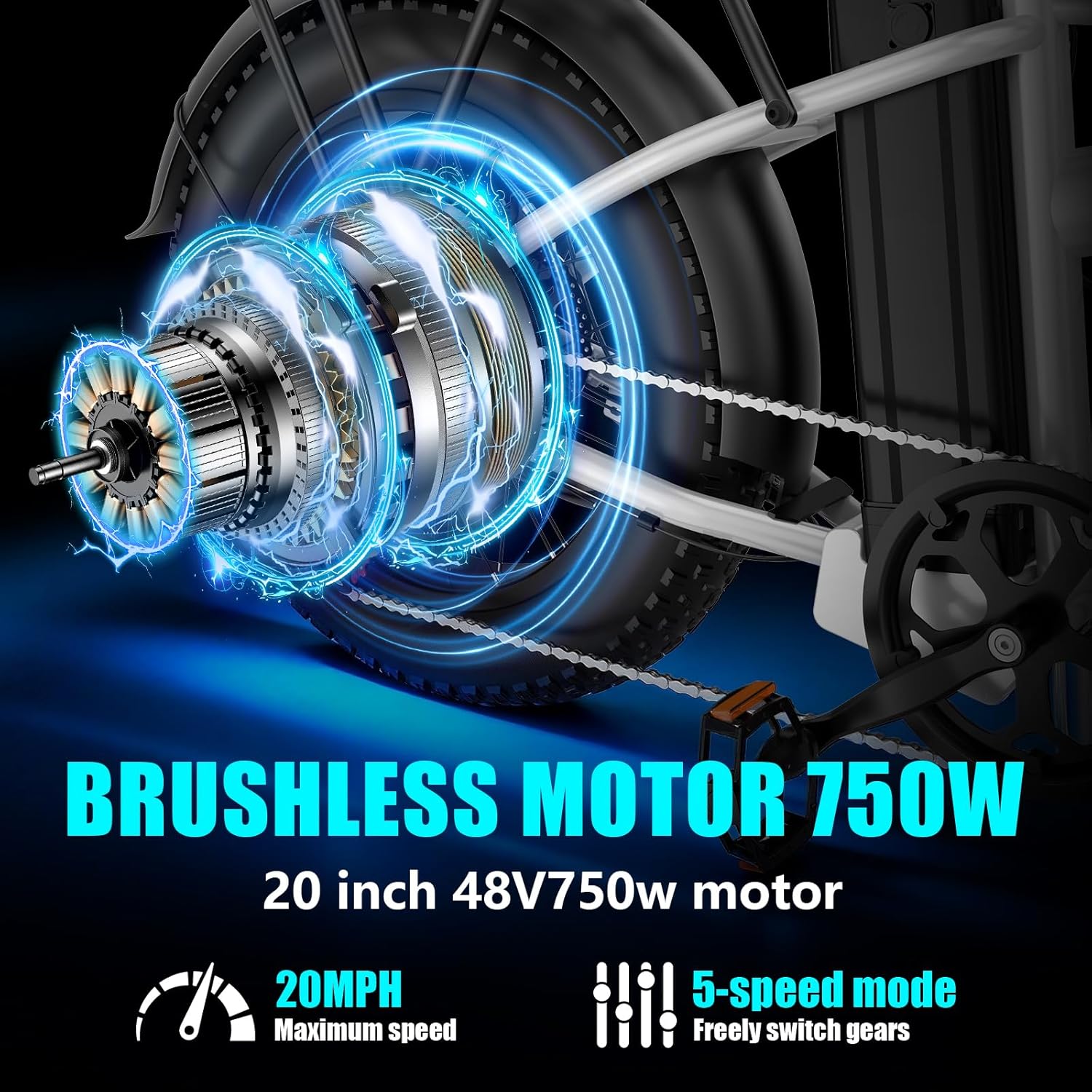 - POWERFUL 750W BRUSHLESS MOTOR Conquer your commute and off-road adventures with a robust 750W motor. It provides strong acceleration and easily tackles hills, with a top assisted speed of 20 MPH for a fast and efficient ride.