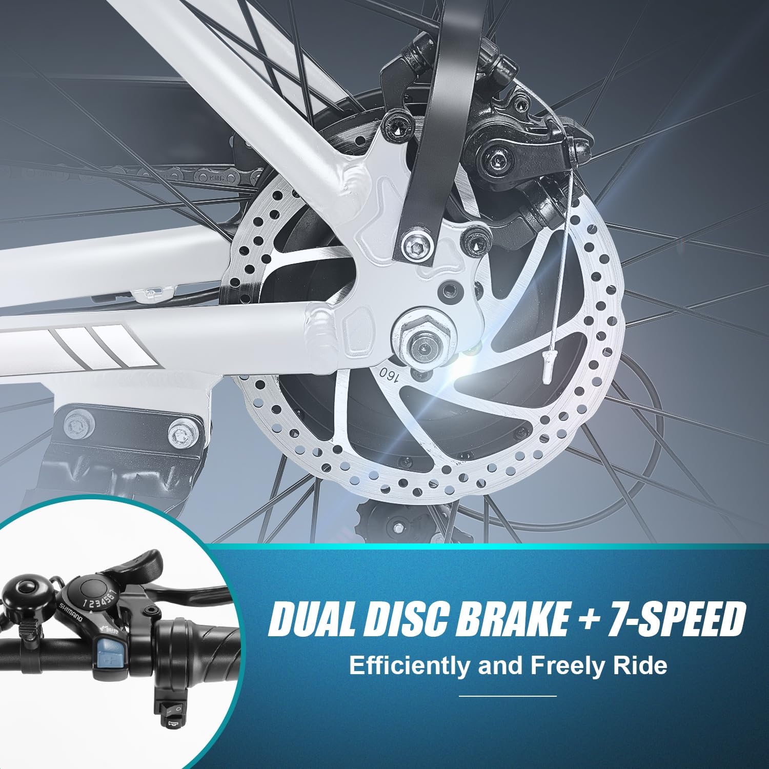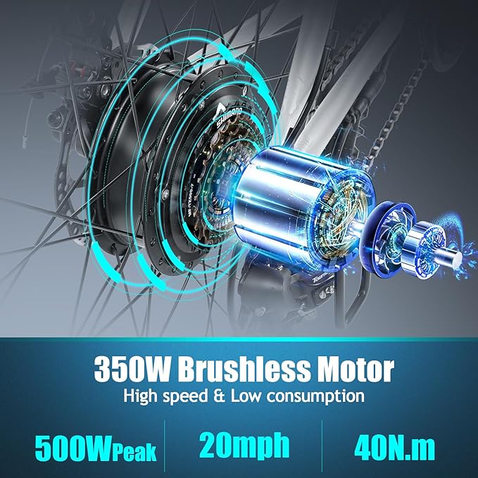 - šćInproved Riding ExperiencećOur electric bike for adults boasts a versatile 7-speed gears system, delivering exceptional hill-climbing power and seamless shifting. Effortlessly adjust your speed across 5 (1-5) power assist levels using the +/- buttons and twisting throttle, offering precise control and a comfortable journey.