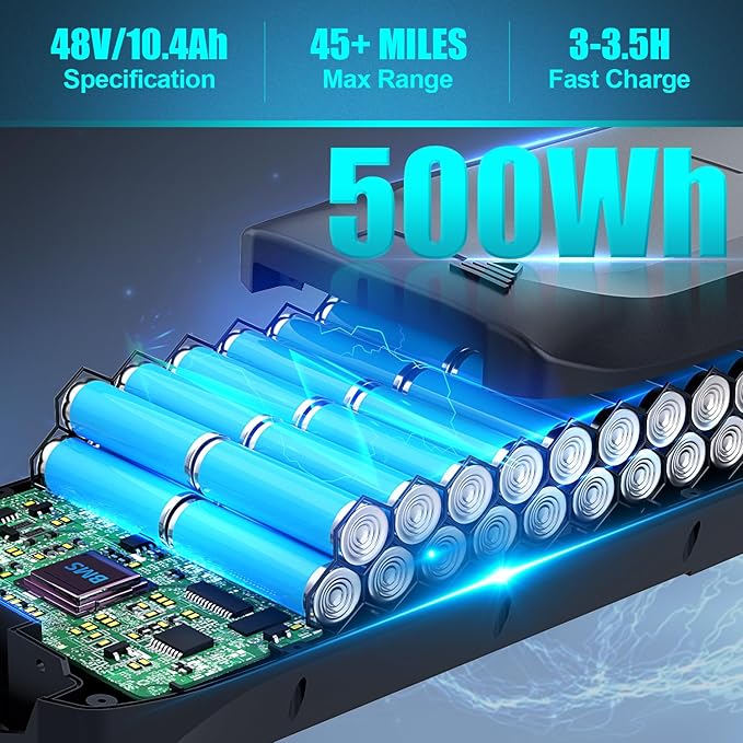 - šćExtended RangećThe advanced 48V/10.4Ah removable battery coupled with a lightning-fast 3A charger, ensures a quick 3-3.5 hour full charge time and a remarkable range of up to 60 miles per charge.