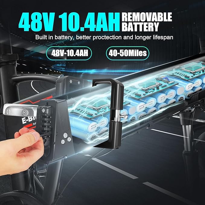 - Hidden Battery &Foldable Design: Equipped with a high-capacity 48V 10.4Ah hidden li-ion battery that can last up to 40-55miles on a single charge. Foldable lightweight aluminum frame makes it easy to store and transport.