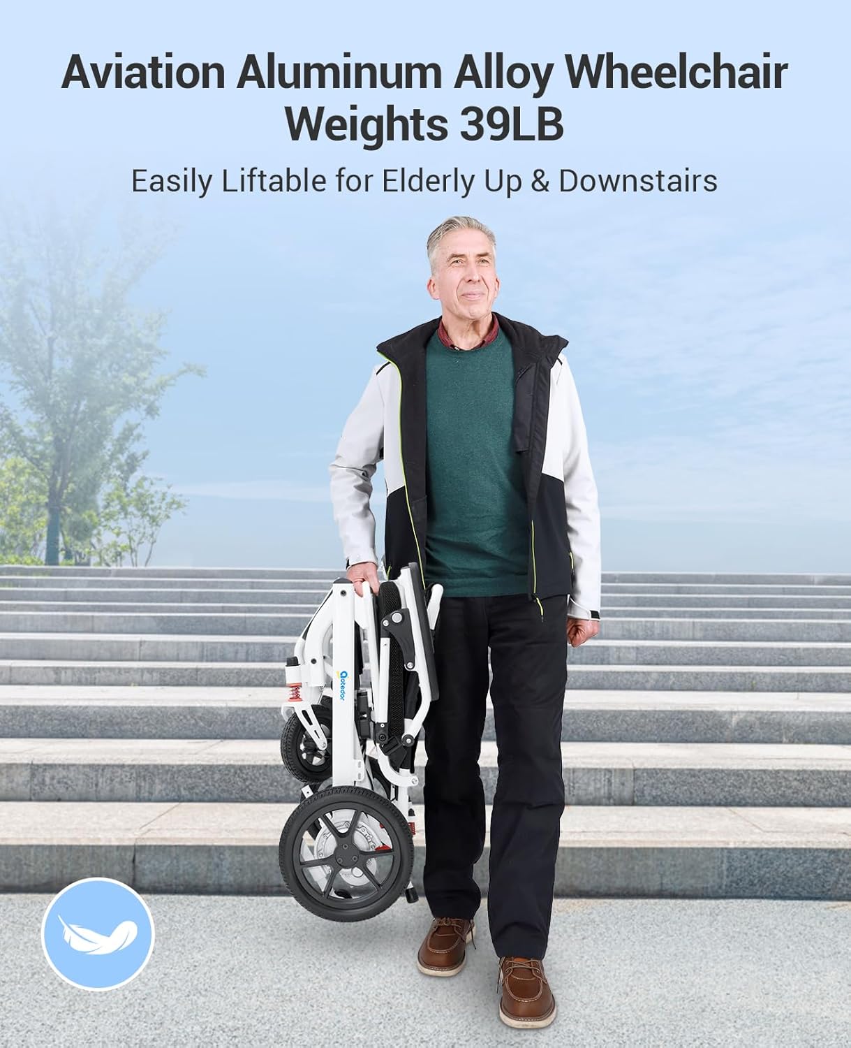 - Ultra-Lightweight and Foldable Design:Crafted with aviation-grade aluminum,this portable electric wheelchair weighs only 39 lbs,making it lighter yet sturdier than traditional models.It supports up to 220 lbs and can be folded in just 3 seconds,making it ideal for travel and easy storage in car trunks.Approved for aircraft use,it’s the perfect travel electric wheelchair for seniors and adults