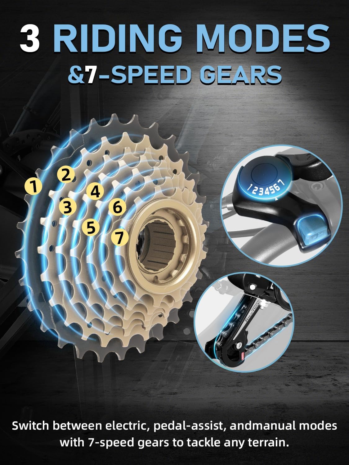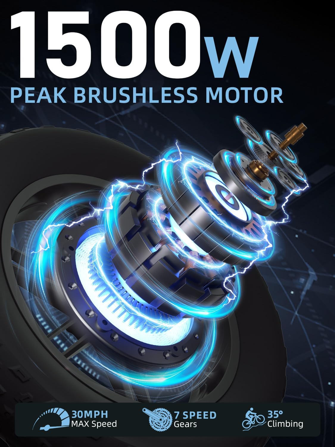 - 【1500W Peak Power Hub Motor & 30° Hill Climbing】Experience high-performance electric bicycle riding with our upgraded 1500W peak brushless hub motor—reach speeds up to 30 MPH in all-electric mode and conquer slopes up to 30°. Equipped with a versatile 7-speed gear system, this e-bike effortlessly handles city commutes and rough off-road trails alike