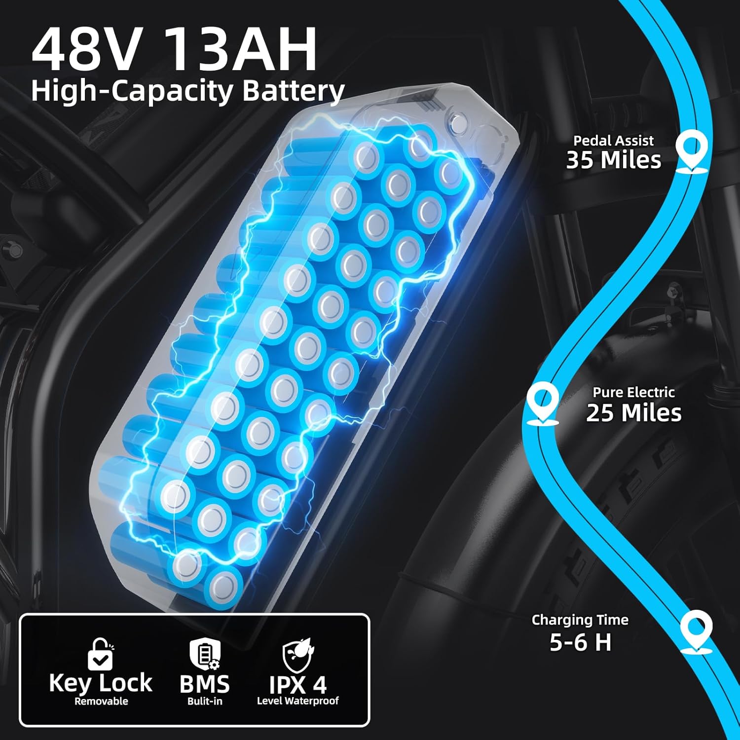 - 【Customizable Long-Range Battery】The S20 Electric Bicycle features a 48V 13Ah detachable lithium battery, delivering up to 25 miles in pure electric mode and 35+ miles with pedal assist. The integrated BMS system safeguards the battery from overcharging and overheating, while the IPX4 water-resistant design ensures dependable performance on urban roads, off-road paths, and extended journeys.