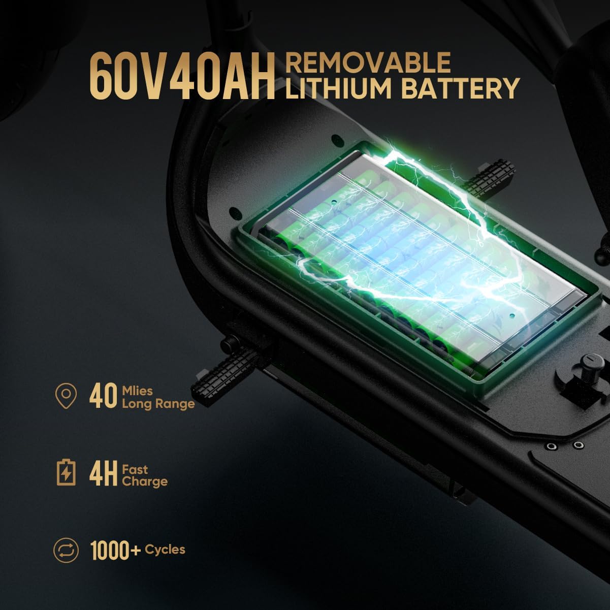 - 【Long-Lasting 60V 30AH Battery & 40+ Mile Range】The Eahora M1P Trike is equipped with a removable 60V 30Ah lithium-ion battery, offering over 40 miles per charge. With a quick 4-hour recharge using a 5A charger and a life cycle of 1000+ charges, it’s designed for daily convenience and extended trips. A reliable choice for the Eahora Electric Motorcycle and electric trike enthusiasts.