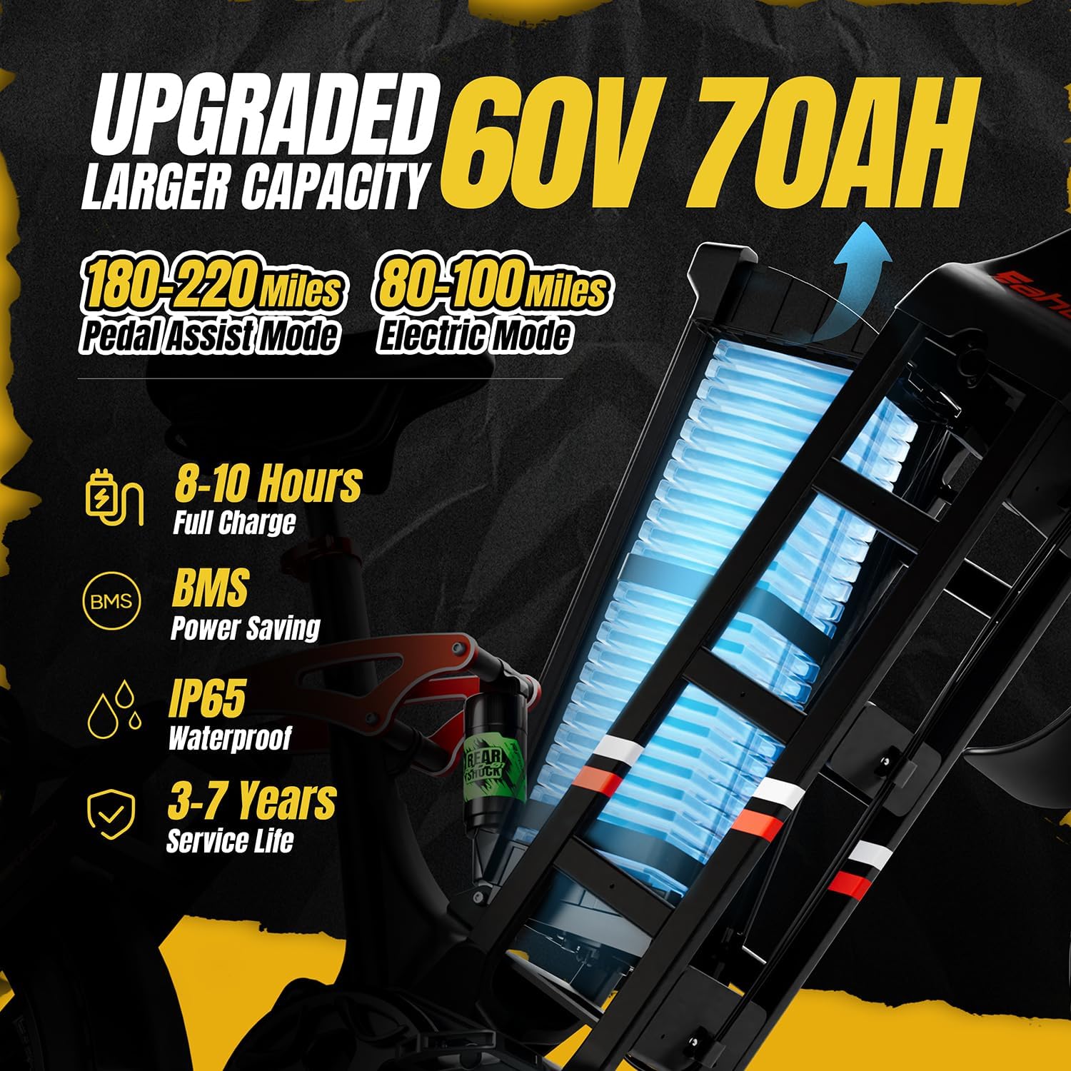 - 🔋【60V 70Ah Battery|220+ Miles Range, “Range Anxiety” Retires Directly!】①🔝Upgrade Highlight:Battery upgraded from 60Ah to 70Ah, 220+ miles per charge (Los Angeles to San Francisco in one go), range increased by 16%!②⏱️Fast Charge Game-Changer:7A fast charger reaches 85% in 6 hours—your bike is fully charged before your pizza gets cold! IP65 waterproof + BMS protection, ride confidently in the rain even when charging on Route 66!