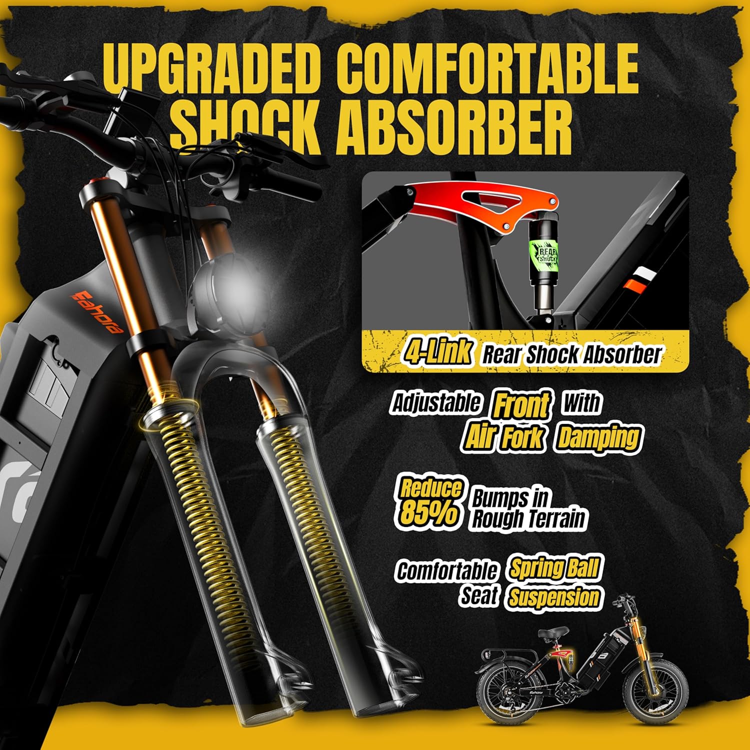 - 🌄【All-Terrain Suspension System|Volcanic Roads Feel Like “Sliding on Clouds”, Bumps? Not a Thing!】①🔝Upgrade Highlight:Lockable adjustable damping front fork + 4-link rear suspension, vibration filtration rate increased by 60%!②🏔️Scenario Showcase:Riding Yellowstone’s volcanic roads? Gravel bumps become “sliding on clouds”; snowmelt gravel roads? As stable as a stationary bike! Paired with 20×4.0 puncture-resistant tires, conquer mountains, snow, and city roads with ease!