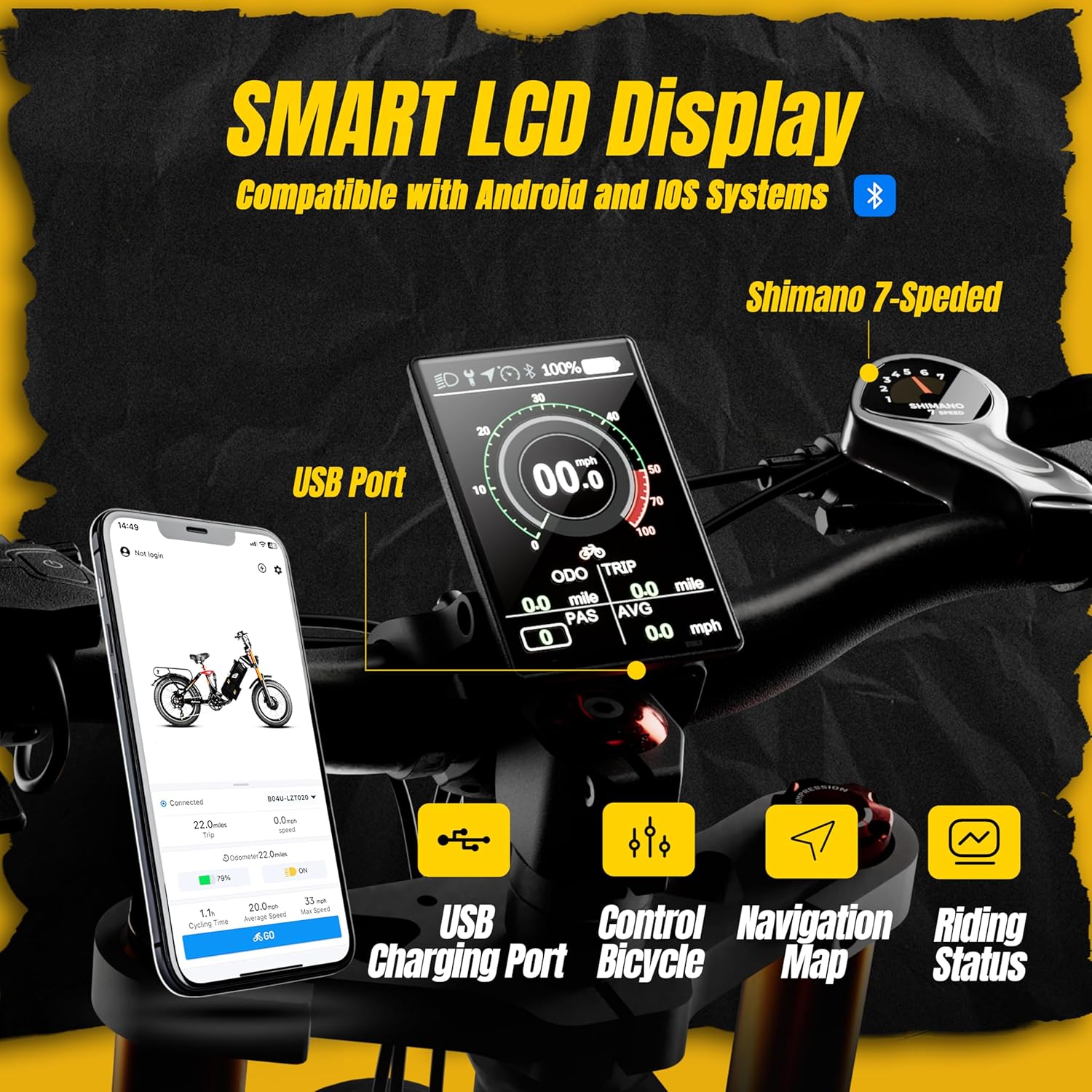 - ⚡Peak 5500W Dual Motor + 5 Riding Modes: ①🔝Upgrade Highlight:Dual 2750W motors (peak 5500W) boost torque by 46%, 120Nm×2 makes 40° Yellowstone slopes feel flat, 0-43MPH in just 4.9s—26% faster than the old model!②🛵Modes for All Scenarios:5 Levels Pedal-Assist + 5 Levels Throttle + 8s Auto-Cruise + 7-Speed Non-Electric + 6KM/H Walk Mode—perfect for commuting, off-roading, and easy pushing, “one bike for three uses” is no exaggeration!