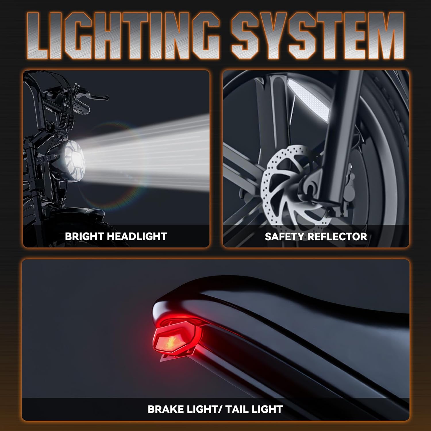 - 【Advanced Suspension System & Safety System】Equipped with dual front forks and seat shock absorbers, which can effectively absorb road impacts and provide a smooth and comfortable riding experience on any terrain. Equipped with 20 x 4.0" fat tires suitable for all terrains and dual hydraulic brakes, it enhances traction during riding and provides a sensitive braking system, ensuring smooth operation.