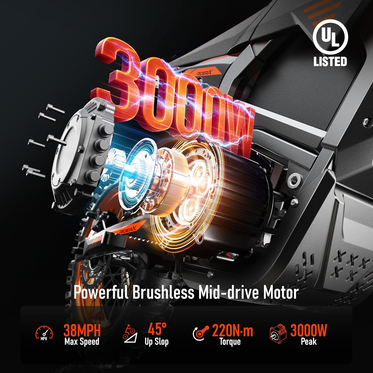 - [Professional 3000W Electric Dirt Bike Motor - 220Nm Torque Climbs 45° Slopes] This high-performance electric dirt bike for teens and adults features QS Motor's torque-boosting mid-drive motor and Far*Drive's waterproof controller. The 3000W brushless motor delivers 220Nm torque to conquer 45° slopes at speeds up to 38MPH, The all-terrain fat tire features progressive knob spacing, cold-resistant soft compound, and a cut-resistant - perfect for trail adventures, mountain climbing, and off-road