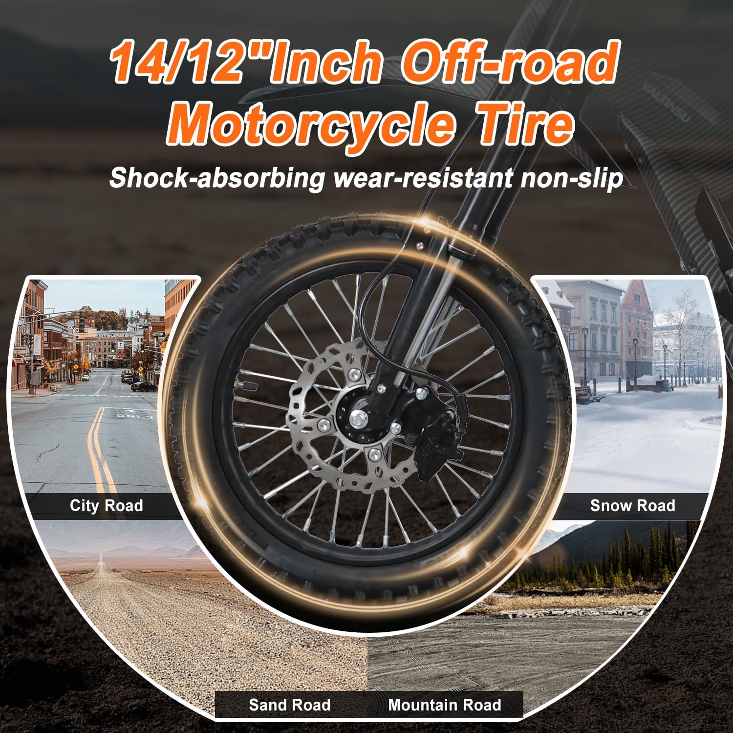 - Confident Control and Stability: The VALTINSU EM5 electric dirt bike features fat tires, dual hydraulic disc brakes front and rear, and a responsive EABS braking system. This combination offers unmatched off-road traction and reliable stopping power, giving teens and adults superior control on diverse terrains.