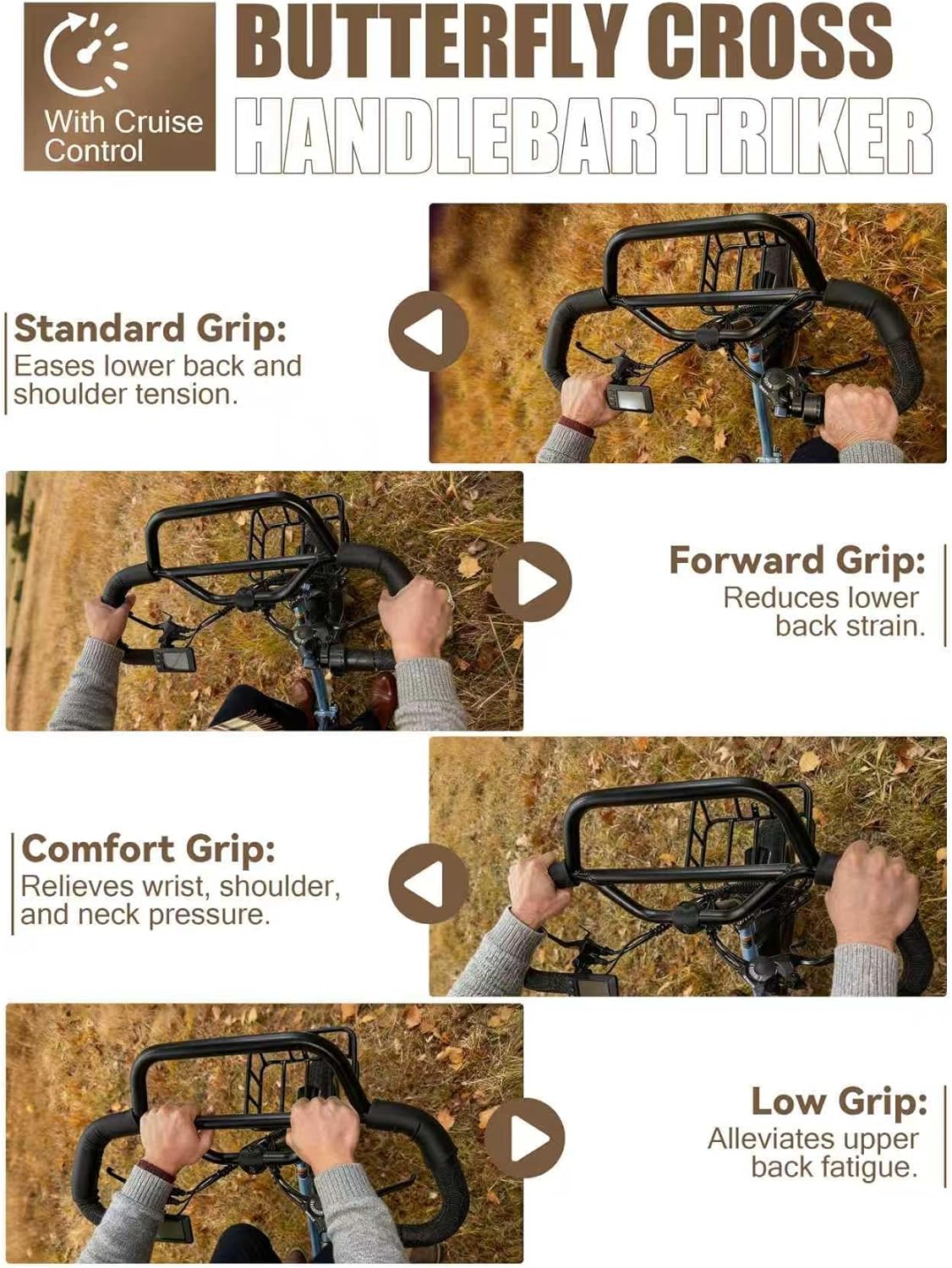 - Revolutionary Comfort: Say goodbye to riding discomfort. The unique Butterfly Handlebar encourages an relaxed, upright posture, allowing you to change hand positions to prevent numbness and fatigue. Paired with the height-adjustable seat and supportive backrest, you can ride for hours in complete comfort.