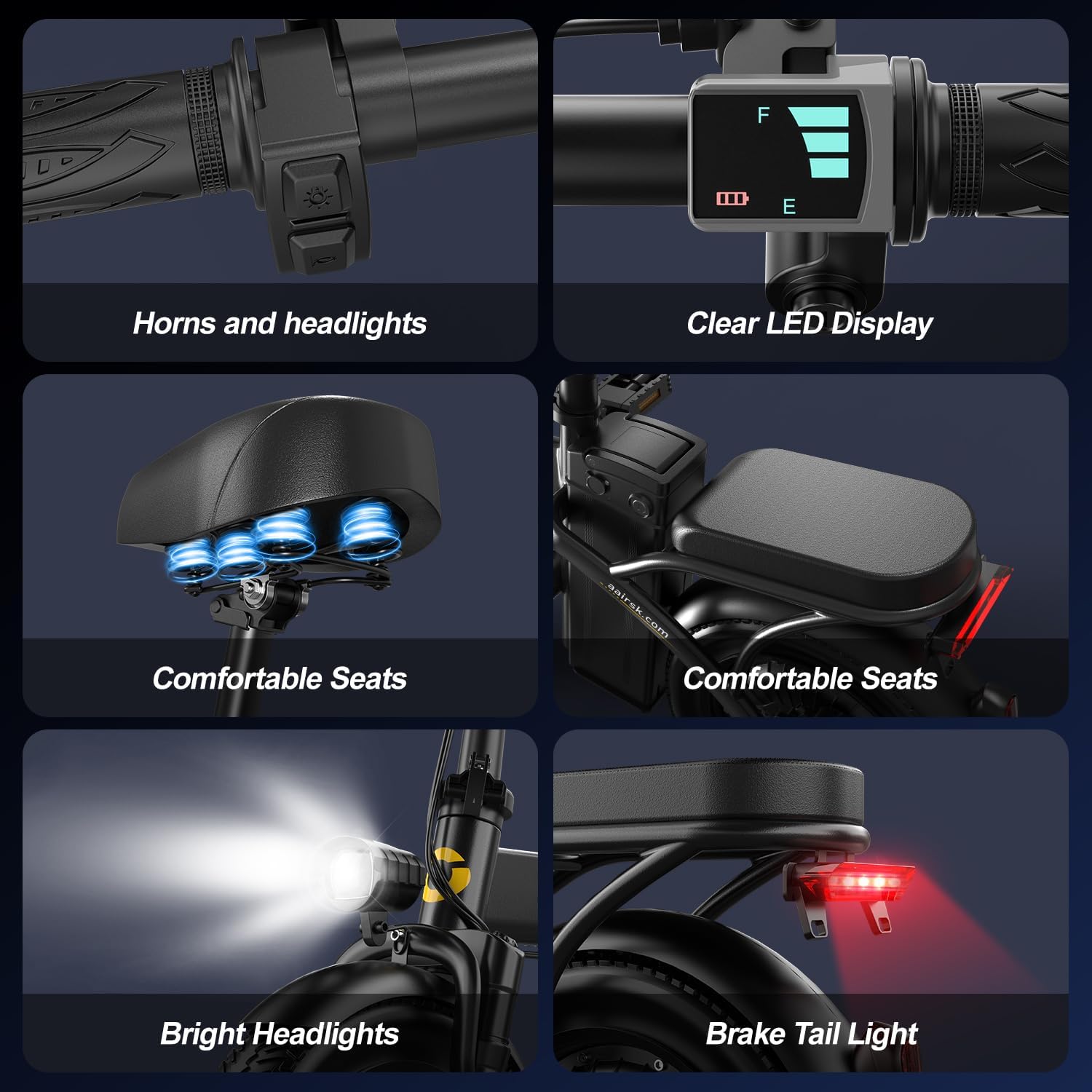 - STABLE & SAFETY - The ergonomic adjustable seat and handlebar heights and the 14" puncture resistant tires are for greater durability. The LED display shows the battery information. The front and rear lights ensure safe riding at night, make your e-bike adapted to complex terrains and keep you safe.