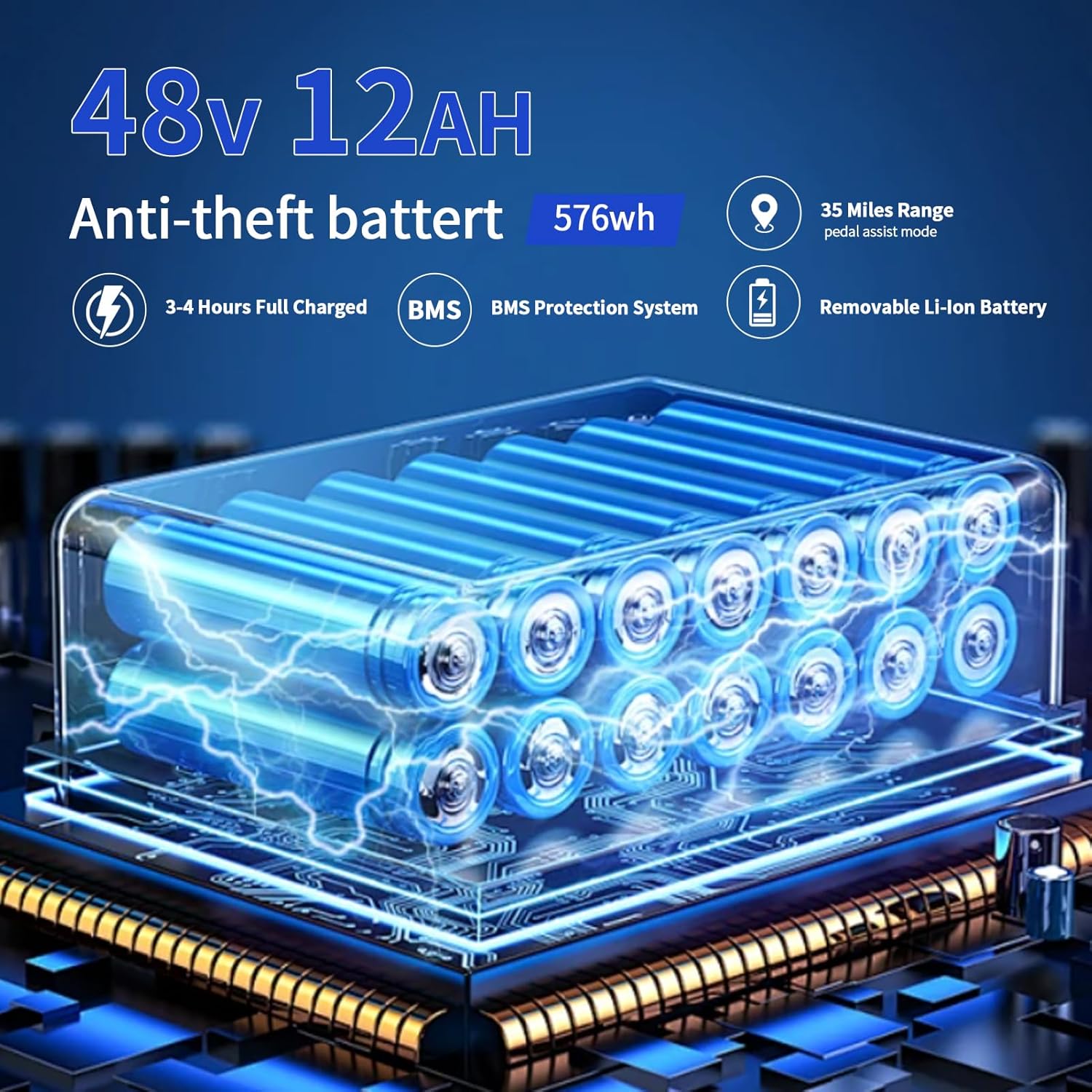 - 【48V12AH Removable Battery】The electric bicycle comes with 48V 12Ah larger battery,with 21~35 miles of pure electric cruising per full charge and more than 35 miles of pedal assist mode. Removable battery makes it easy to charge, 4-5 hours fully charged.