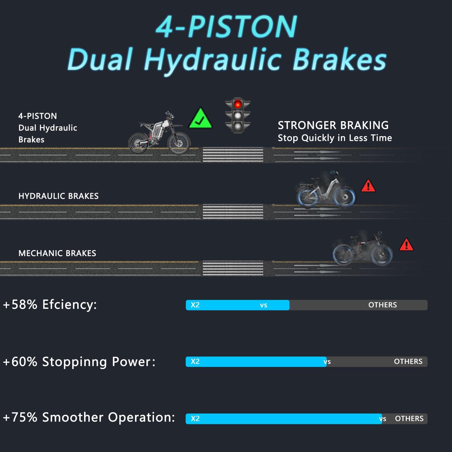 - Precision Control, Unmatched Safety Safety meets precision with the SX3's advanced hydraulic brake system, providing unparalleled stopping power and control. Whether navigating tricky descents or encountering unexpected obstacles, the front and rear hydraulic brakes deliver swift and responsive braking, keeping you in command of every ride. Plus, the self-adjusting brake pads ensure consistent performance mile after mile.