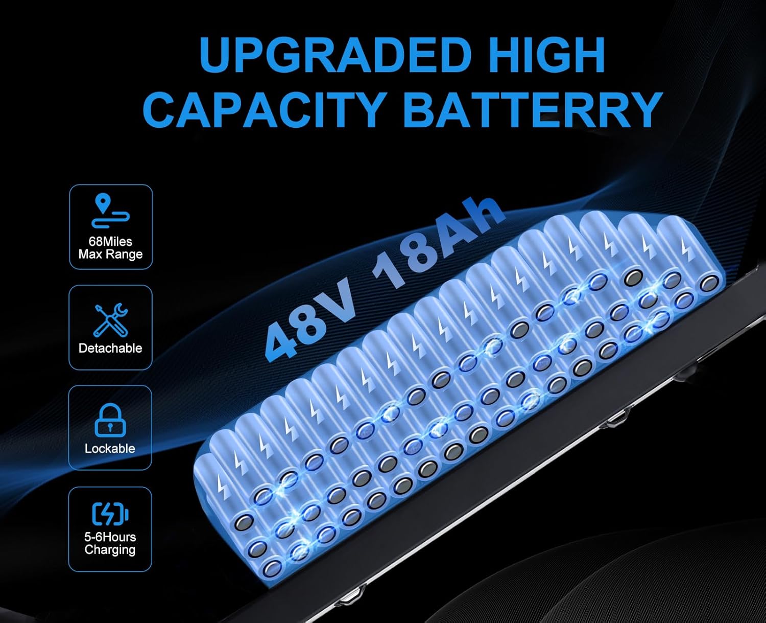 - š²ćRemovable Long Range BatteryćEbikes for adults with 48V 18AH large battery, covers a range of 68 miles(pedal assist) per charge for 5-6 hours. The removable design provides more convenient to charge battery whether you are at home or in the office