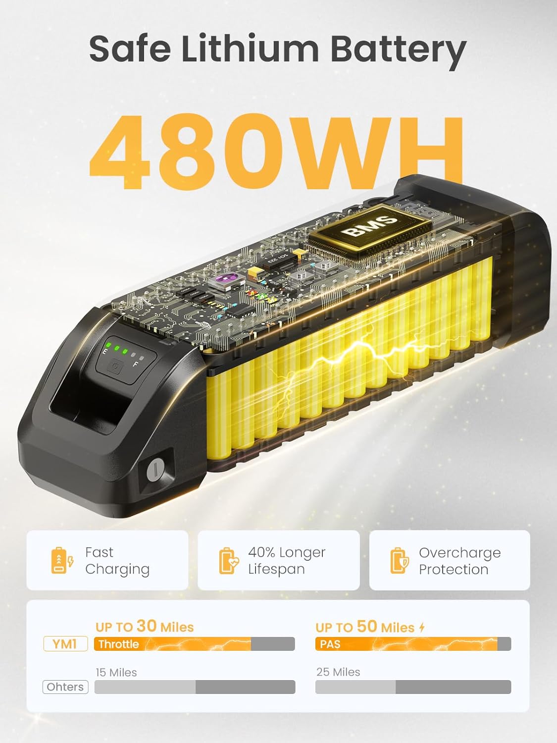 - [48V 10Ah Removable Battery]- The Electric Bike is powered by a high-capacity 480WH powerful battery, allowing for extended ride times with a range of 31-50 miles per charge(5-6 hours fully charged). Not only does the ebike have a removable, fast-charging battery, but it also includes overcharge protection, adding an extra layer of safety to every ride.