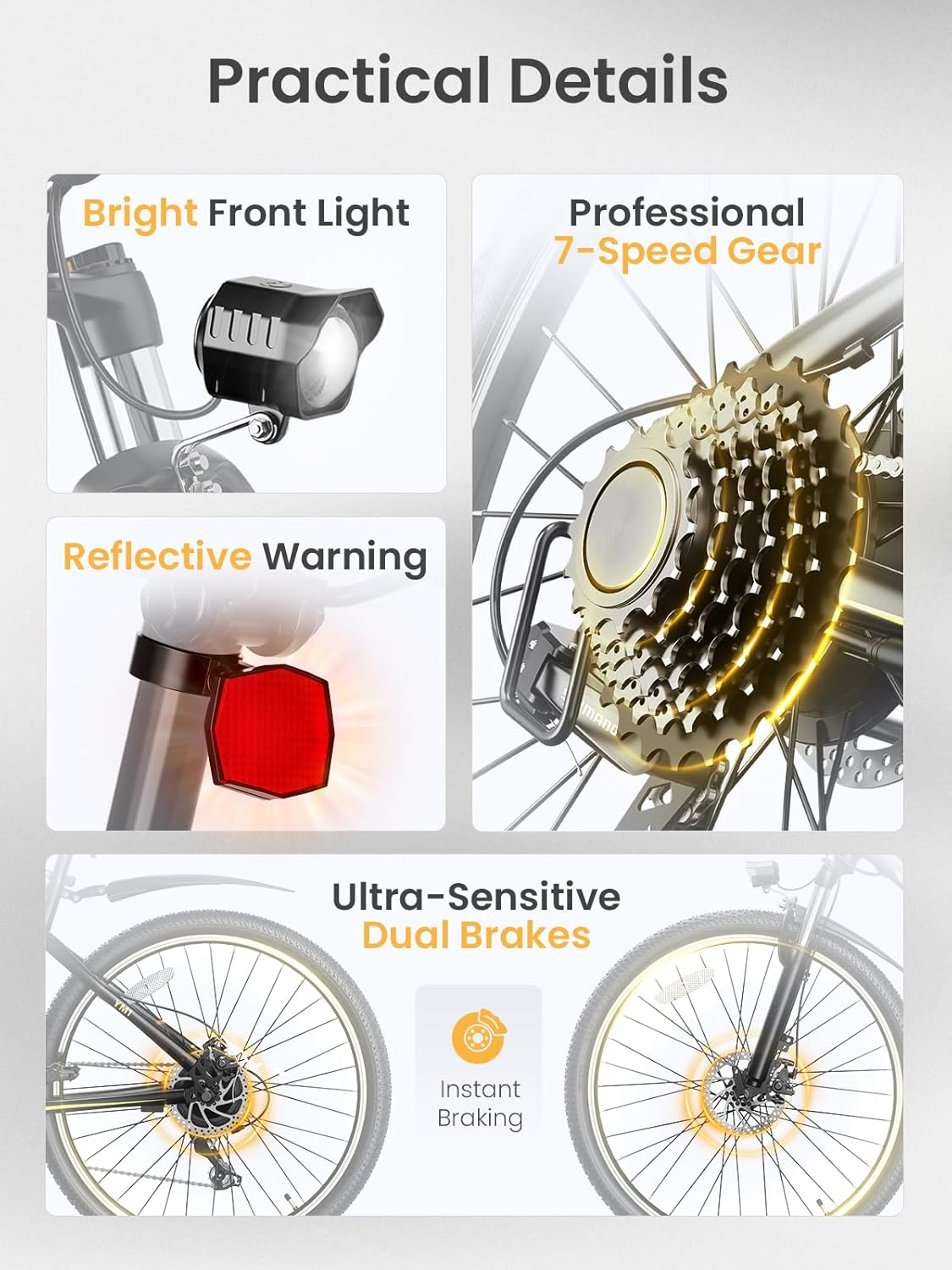 - [Safety and Durability]- The electric bicycle features 27.5'' puncture-resistant tires, an adjustable ergonomic seat, a high-strength front suspension fork, a bright LED headlight, a smart LCD display, sturdy fenders, and dual disc brakes. These features enhance riding comfort, adapt the ebike for adults to different riding situations, and provide peace of mind with every ride.