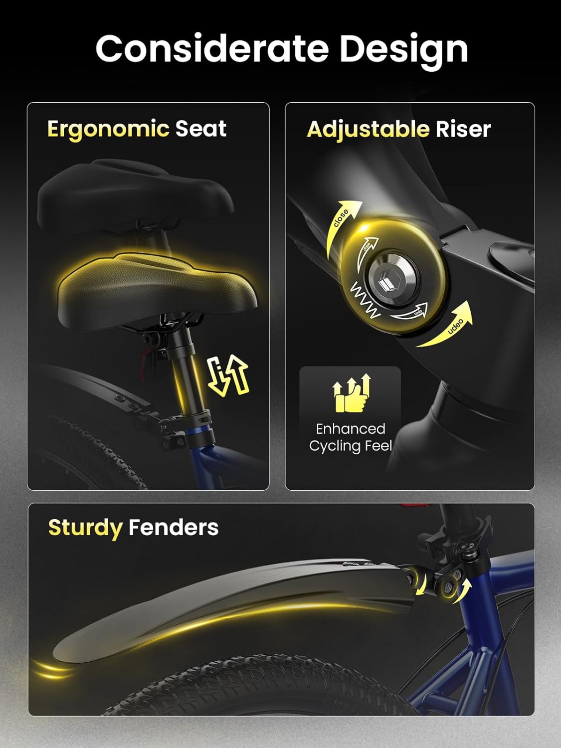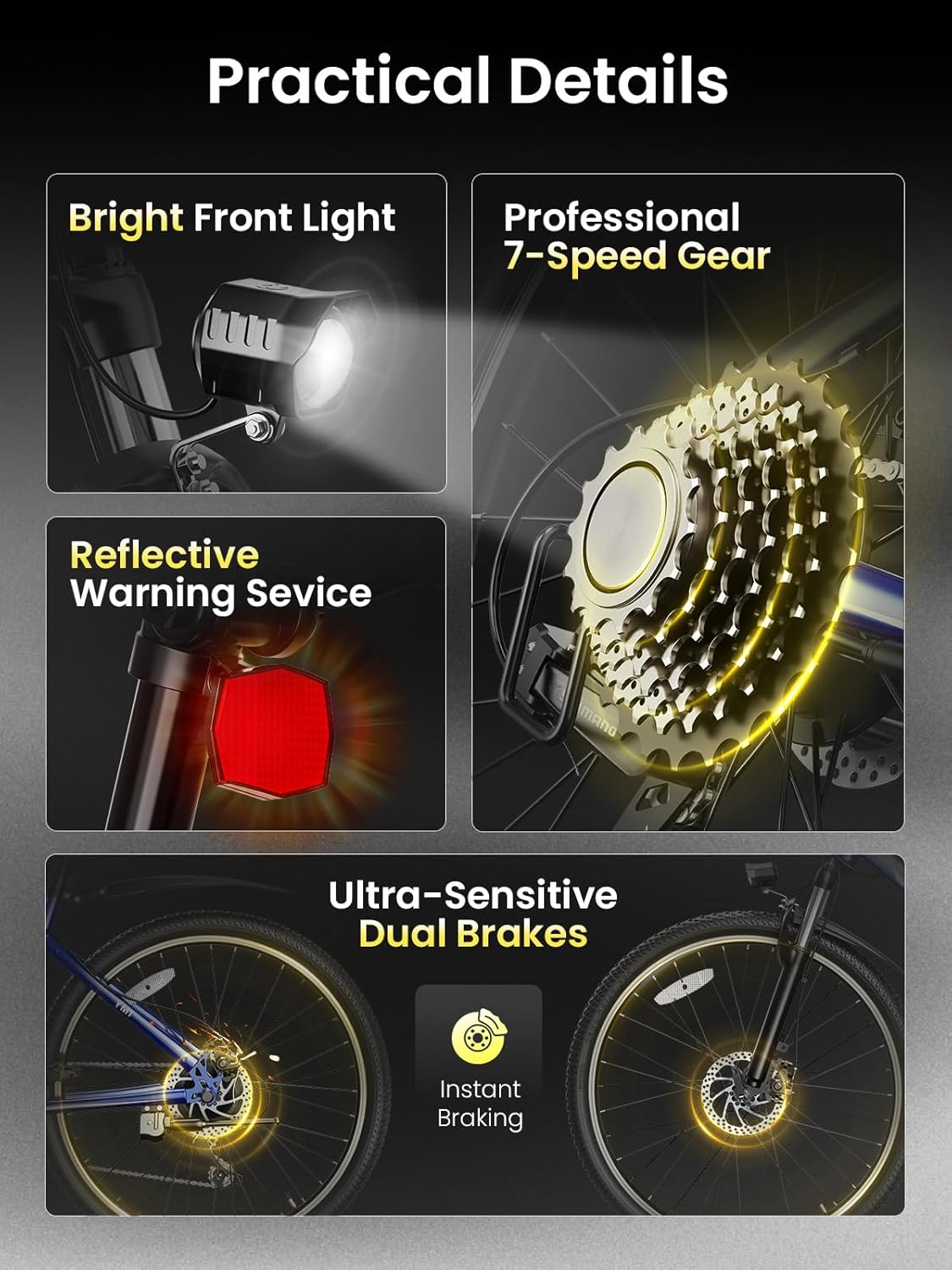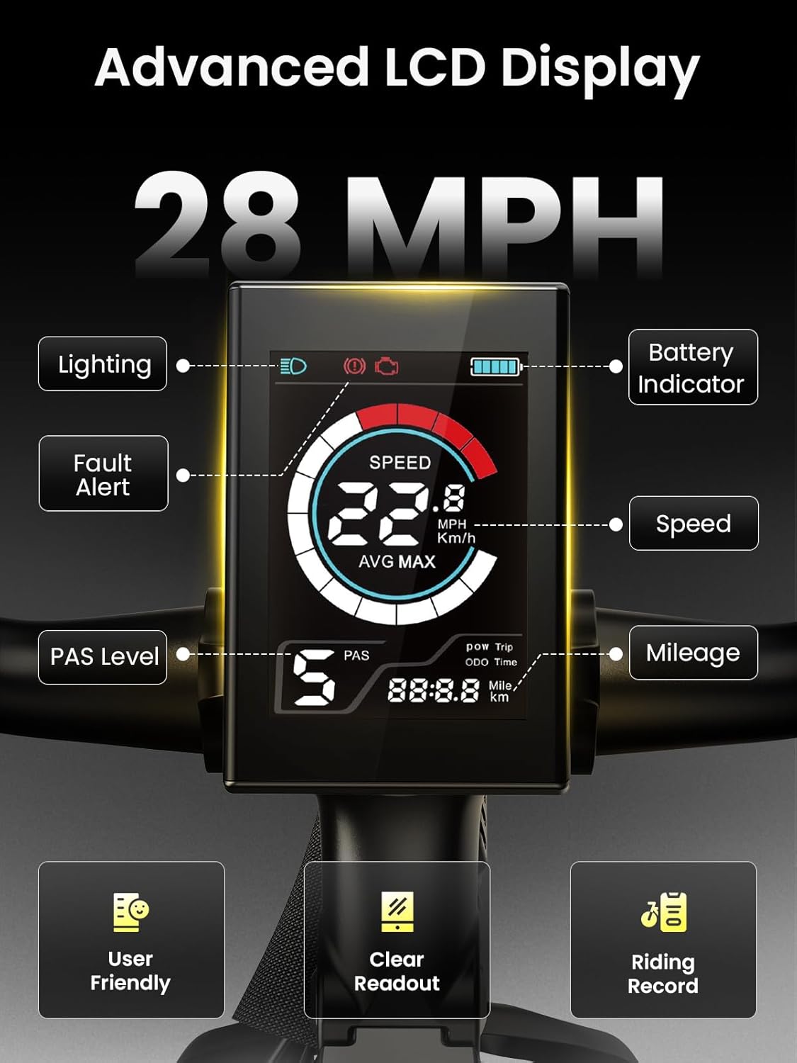 - [Riding Safety and Durability]- Equipped with 27.5'' puncture-resistant tires, an adjustable ergonomic seat, and an upgrade front suspension fork, the electric bicycle ensures a smooth, comfortable ride on various terrains. The bright LED headlight and smart LCD display enhance visibility and convenience, while the dual disc brakes provide reliable stopping power. Additional features like the adjustable riser and sturdy fenders further improve riding comfort and versatility.