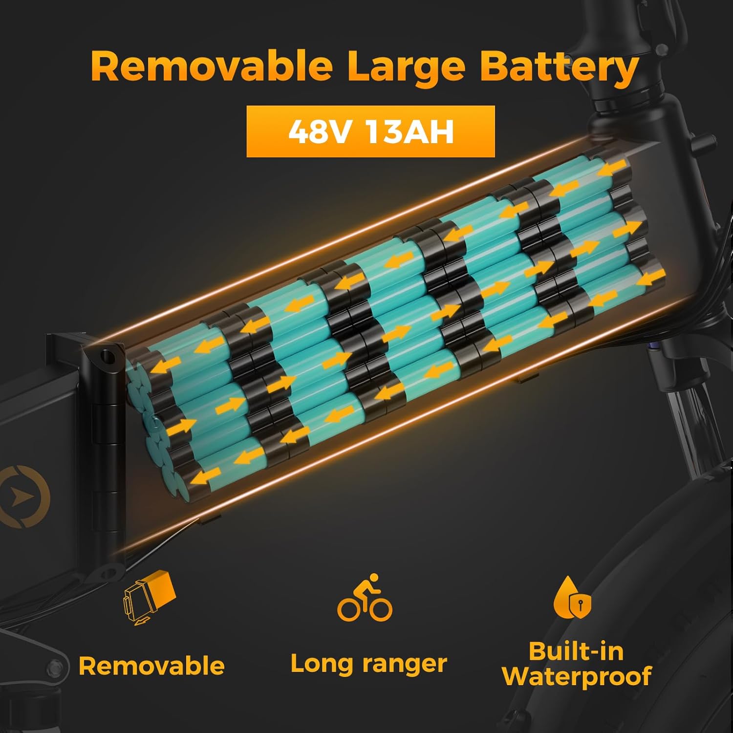 - Upgraded Battery - Not only the excellent motor but also an upgraded battery equipped, the 48v 13Ah lithium-ion battery covers a range of 55-70 miles per full charge. The removable battery design makes charging more convenient. dustproof and dampproof, guarantee the safety and life of the battery.