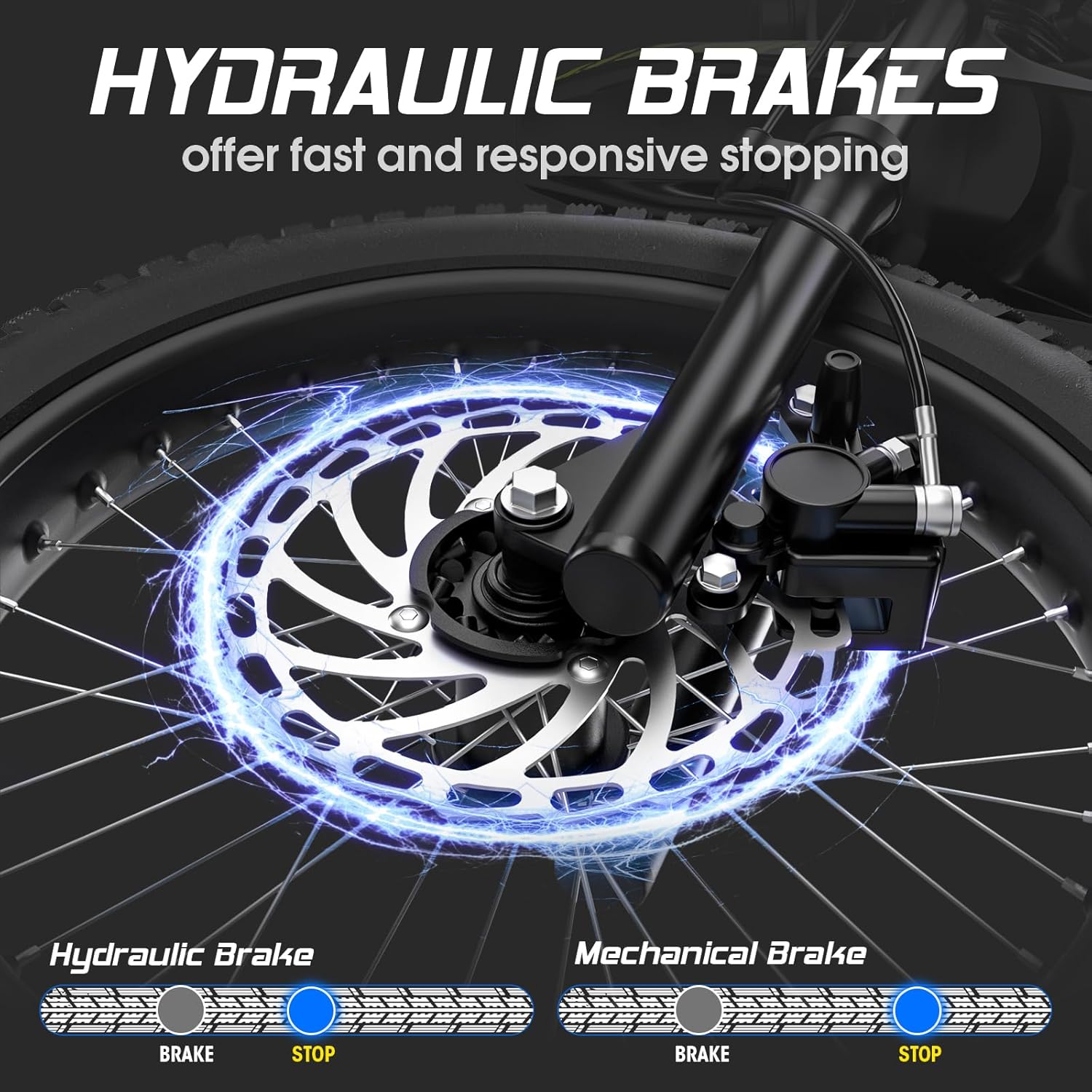 - 🚲【Professional-Grade Hydraulic Brakes & Dual Suspension】Adult dirt bike is equipped with advanced hydraulic forks and rear air spring shock absorbers that work together to effectively absorb bumps and shocks on the road. Combined with a highly responsive and efficient hydraulic braking system, it ensures reliable braking performance in complex terrains such as rugged mountain roads, while bringing a stable and safe riding experience to riders.