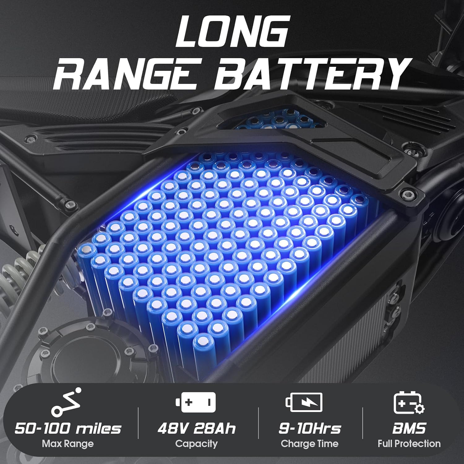 - 🚲【Extended Range & Efficient Lithium Battery】 Electric motorcycle experience extended adventures with a 48V 28AH removable lithium battery, offering up to 100 miles per charge. Featuring advanced BMS protection against overcharging and over-discharging, this battery ensures enhanced durability and recharge safety. Fully recharge in just 8 hours and enjoy peace of mind with long-lasting performance—ideal for off-road exploration and daily commutes without range anxiety.