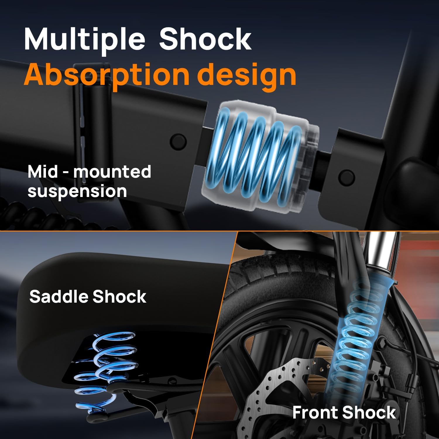 - 【Triple Shock Absorption System】Front fork + central + seat suspension absorbs 82% of road vibrations, ensuring ultra-smooth rides on any terrain with this electric bicycle for adults.