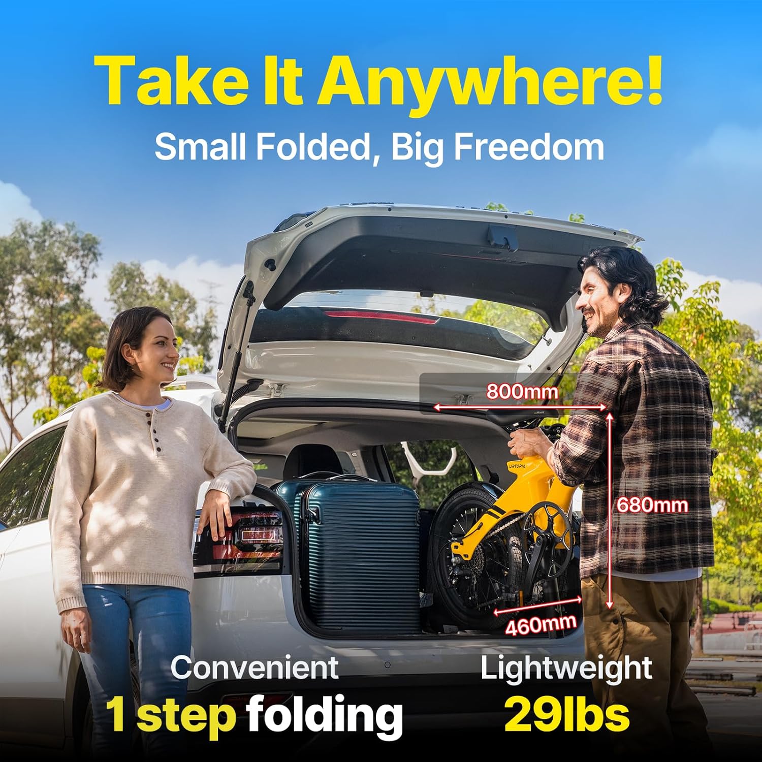 - 𝐒𝐩𝐚𝐜𝐞-𝐒𝐚𝐯𝐢𝐧𝐠 - 𝐔𝐥𝐭𝐫𝐚-𝐂𝐨𝐦𝐩𝐚𝐜𝐭 𝐅𝐨𝐥𝐝𝐚𝐛𝐥𝐞 𝐄-𝐛𝐢𝐤𝐞: With an ingenious structure, this foldable e-bike measures only 26 inches in height when folded. It fits effortlessly in a sedan trunk, making it the perfect choice for travel or commuting.