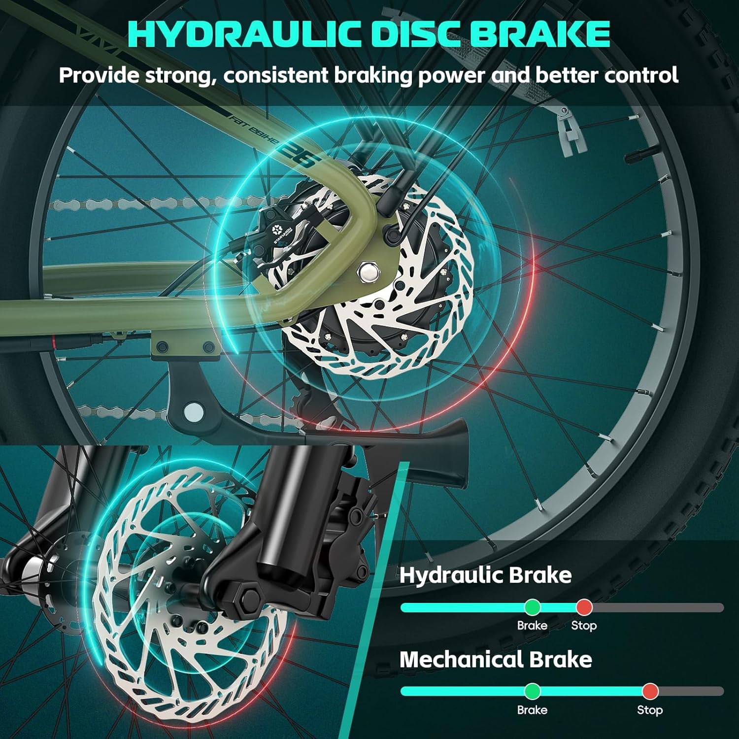 - ALL TERRAIN FAT TIRE MOUNTAIN BIKE: Electric mountain bike features 26* 4.0" fat tires that are wear-resistant, excellent grip and slip resistance, perfect for any road condition, including sand, snow, gravel and mountain paths