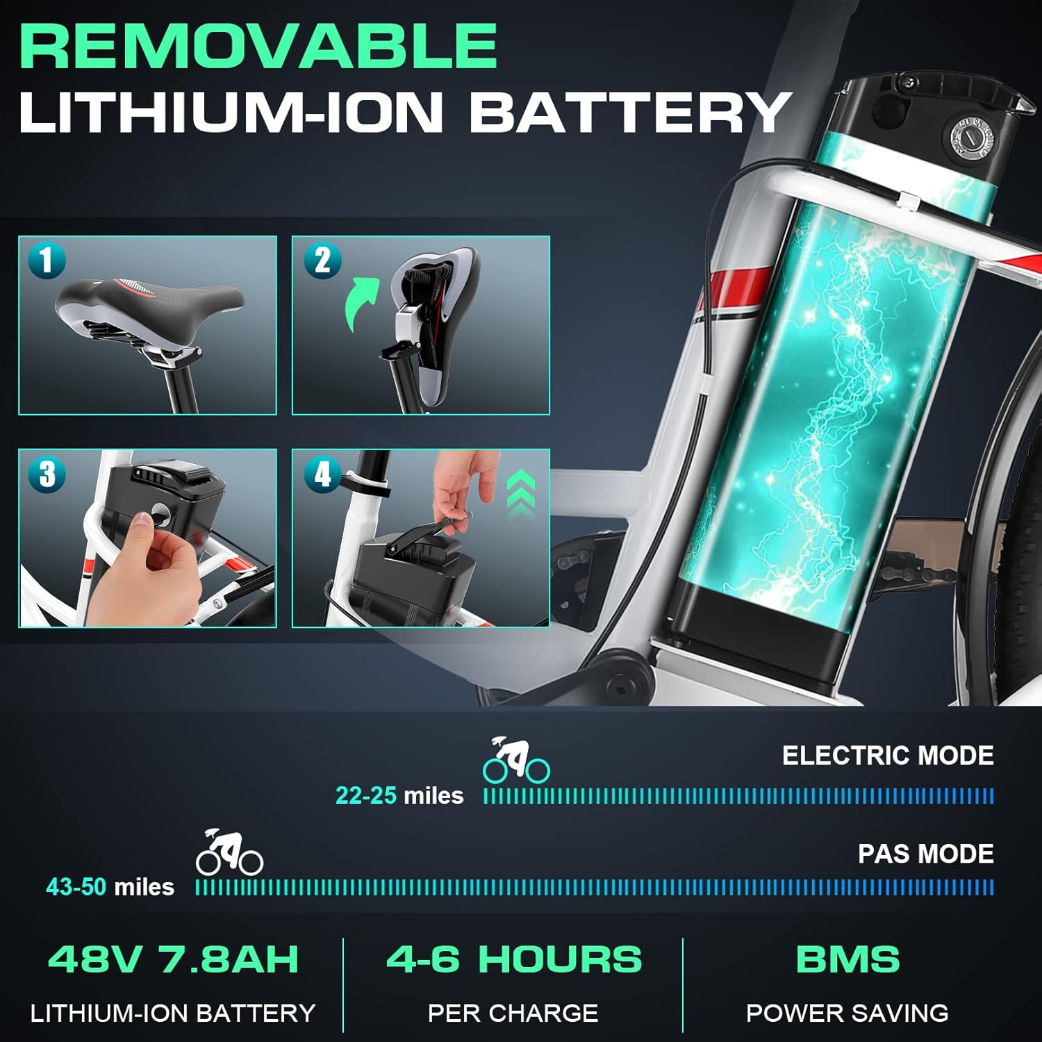 - REMOVABLE BATTERY: Equipped with the removable battery, this ebike is capable to achieve 22-25 miles in full electric mode and 44-50 miles in pedal assist mode (PAS mode). Two charging ways, charging on the bike or removing the battery for charging, you can bring the battery to your home or office to recharge, fully charged in 4-6 hours. Your daily commute will be faster and more cost-efficient.