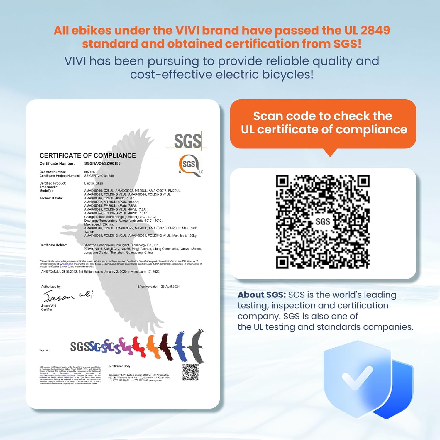 Vivi Electric Bike, 26" Electric Cruiser Bike 1000W Peak Ebike 22MPH Electric Bike for Adults, 48V Removable Battery, Cruise Control, 7 Speed Electric City Commuter Bicycle, SGS Certified to UL2849