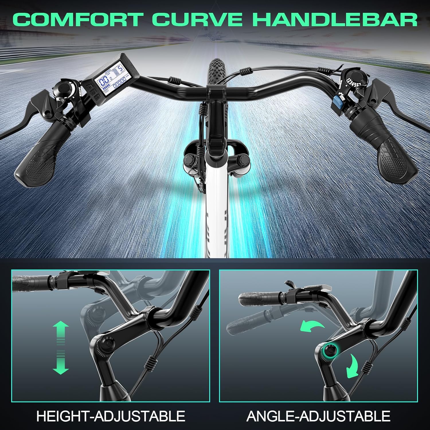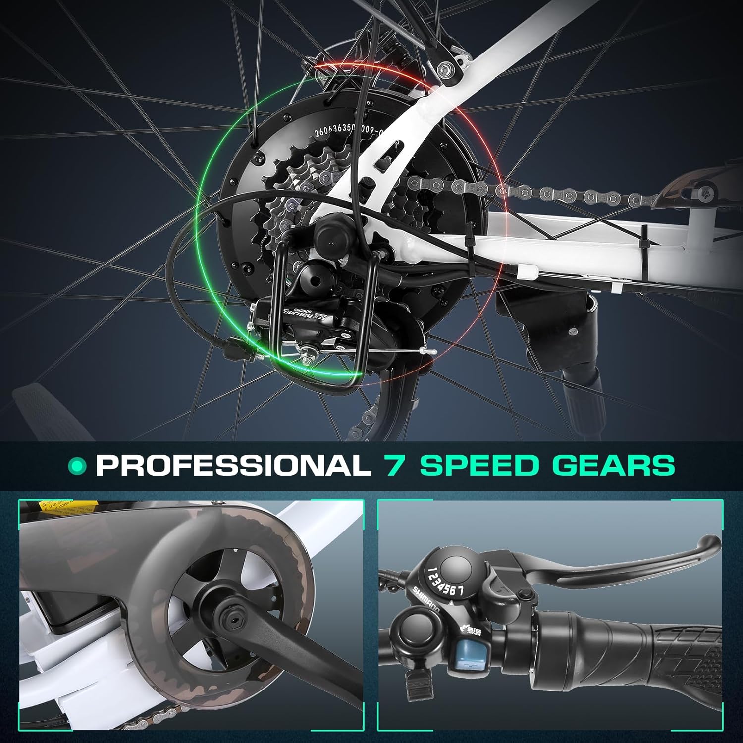 - PREMIUM CONFIGURATION: With front and rear disc brakes for reliable all-weather stopping power, fully protect your safety. Professional 7 speed transmission system, you can choose any speed according to your needs, enjoy a safe and smooth journey. The comfortable seat and wide handlebars are great for long leisurely rides or commutes to and from work. Equipped with detachable waterproof line design, easy to replace accessories