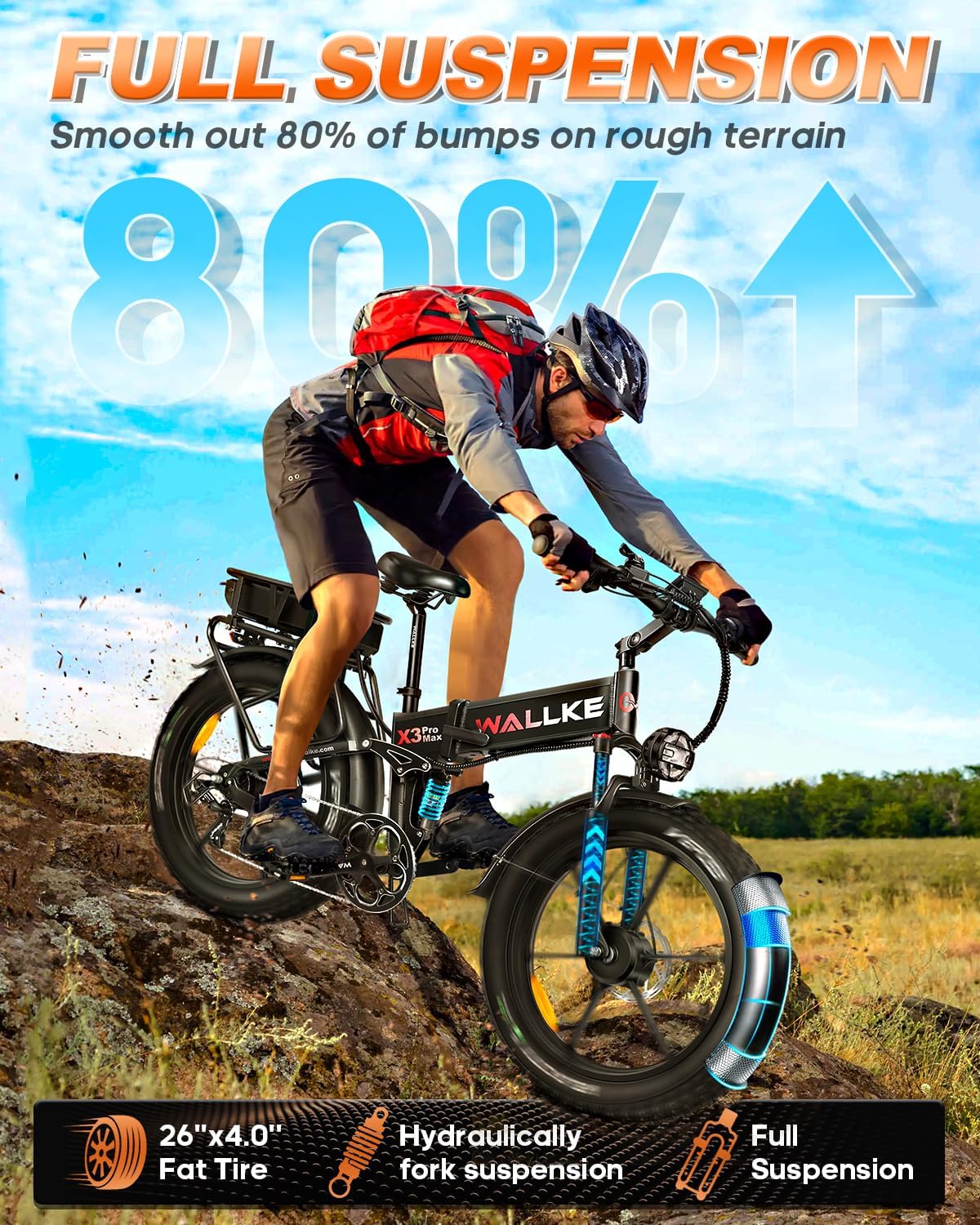 Wallke was founded on a promise: For over 7 years, engineered e-bikes with 2800W Peak Powerful Dual Hub Motors 48V 44AH Long Range Dual Battery Hydraulic Full Suspension & Dual Rear Shockers 4-Piston Hydraulic Brakes & Dual Suspension System Why X3 PRO MAX Fat Tire